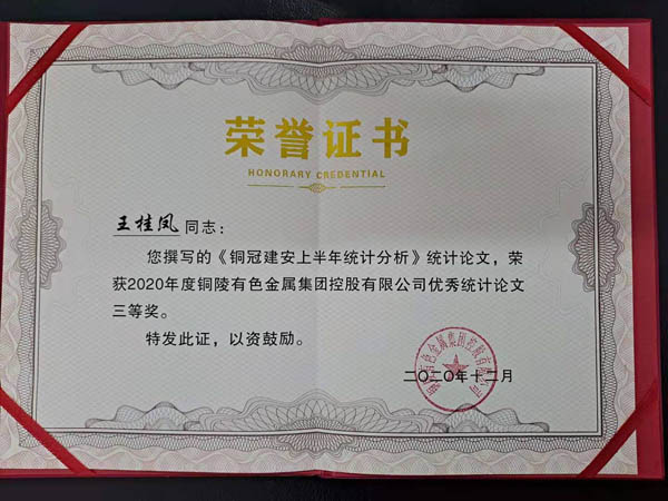 12月29日,在集團公司統(tǒng)計工作會議上,公司獲“2020年度統(tǒng)計工作先進(jìn)單位”榮譽稱號,公司《銅冠建安上半年統(tǒng)計分析》論文榮獲集團公司優(yōu)秀統(tǒng)計論文三等獎。
